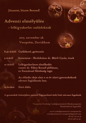 A Veszprémi Főegyházmegye családpasztorációja 2015. november 28-án szombaton délelőtt tartja Veszprémben, a Davidikum kollégiumban (Eszterházy Antal u. 15.) Adventi elmélyülés - családos lelkigyakorlatát.