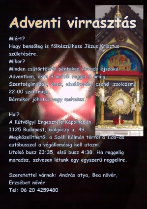 Program: Virrasztás szentségimádással, énekkel, elmélkedéssel, zsolozsmával.