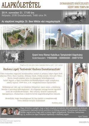 November 21-én, pénteken 17 órakor a II. világháborúban felrobbantott Dunaharaszti Rákócziligeti Szent Imre-templom újjáépítésének alapkőletételére várják az érdeklődőket Dunaharasztiba.