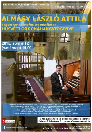 Április 12-én, Húsvét 2. vasárnapján 19 órakor hangversenyt ad Almásy László Attila, a Szent Anna-templom orgonistája.