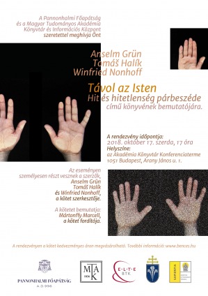 Program: Anselm Grün - Tomáš Halík - Winfried Nonhoff: Távol az Isten. Hit és hitetlenség párbeszéde című könyvének bemutatója a szerzők és a kötet szerkesztője személyes részvételével A kötetet bemutatja: Mártonffy Marcell, a kötet fordítója