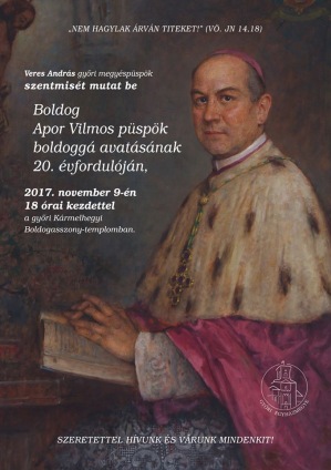 Veres András győri megyéspüspök szentmisét mutat be Boldog Apor Vilmos püspök boldoggá avatásának 20. évfordulóján, 2017. november 9-én 18 órai kezdettel a győri Kármelhegyi Boldogasszony-templomban.