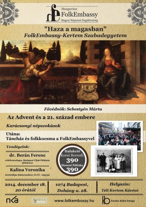 A FolkEmbassy szabadegyetem következő alkalmának témája Kalina Veronika előadásának keretében az adventi időszakhoz és a karácsonyhoz kapcsolódó népszokások lesznek; továbbá Berán Ferenc atya a 21. század emberének adventhez fűződő kapcsolatáról fog beszélni.