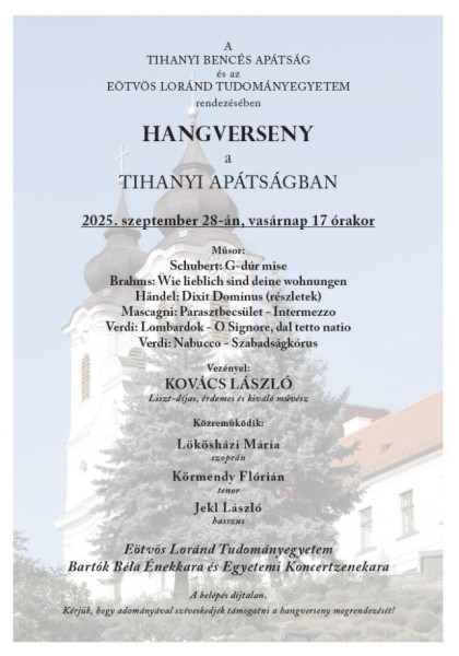 Az Eötvös Loránd Tudományegyetem (ELTE) Bartók Béla Énekkara és Egyetemi Koncertzenekara 2025. szeptember 28-án immár 29. alkalommal ad koncertet a Tihanyi Bencés Apátságban.