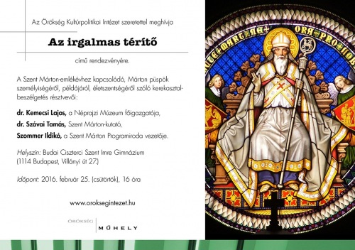 Az Örökség Kultúrpolitikai Intézet Örökség Műhely című sorozatának február 25-én, csütörtökön 16 órakor tartandó kerekasztal-beszélgetésén arról kérdezik a beszélgetés résztvevőit, hogy miként mutatható fel egy, az irgalmasság életprogramját megvalósító szent, a katonából lett püspök Márton életeszménye a jelenkor embere számára.