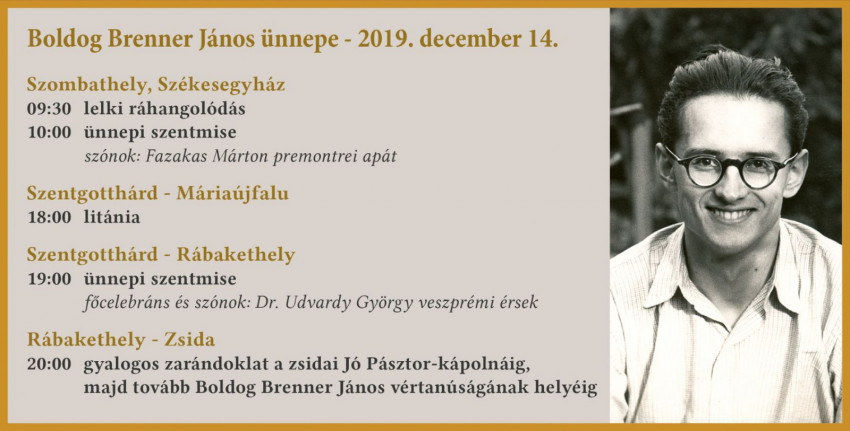 20:00 Gyalogos zarándoklat a zsidai Jó Pásztor-kápolnáig, majd tovább Boldog Brenner János vértanúságának helyéig