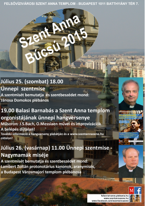 A Budapest–felsővízivárosi Szent Anna-templom (1011 Budapest, Batthyány tér 7.) templombúcsúját július 25-én, szombaton és 26-án, vasárnap tartja.