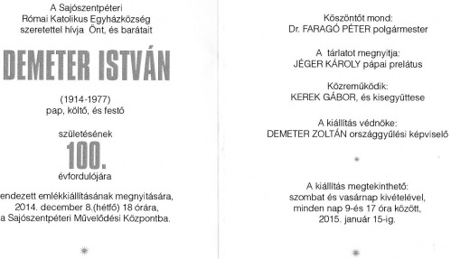 December 8-án, hétfőn 18 órakor Sajószentpéteren is megünneplik Demeter István pap, költő és festő születésének 100. évfordulóját, melyre minden érdeklődőt szeretettel vár a Sajószentpéteri Római Katolikus egyházközség.