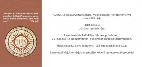 Időpont: 2018. május 12., szombat 15:00 óraHelyszín: Jézus Szíve-templom (1085 Budapest, Mária utca 25.) Program: Dr. Erdő Péter bíboros, prímás diakónussá szenteli Elek László jezsuitát