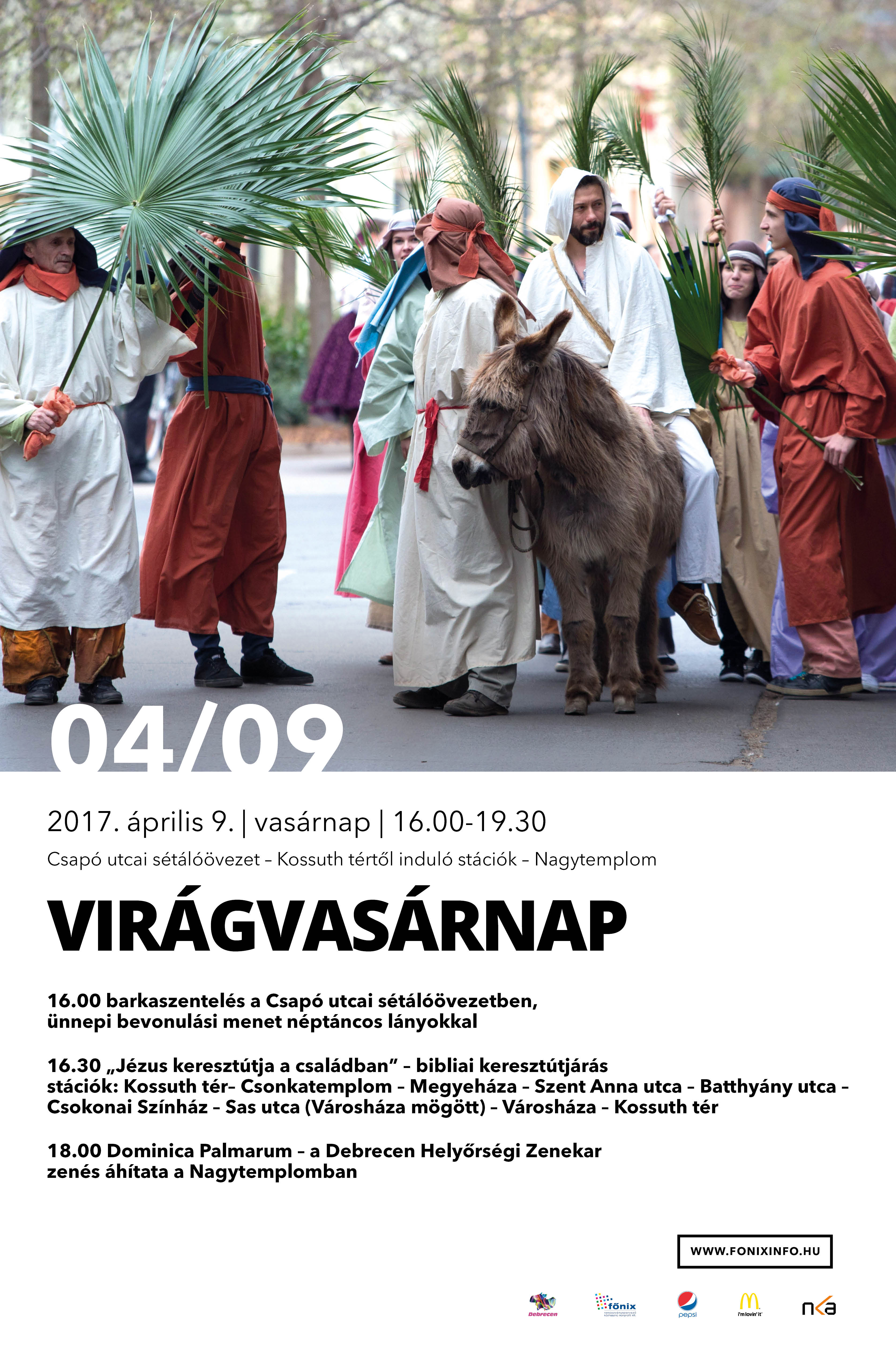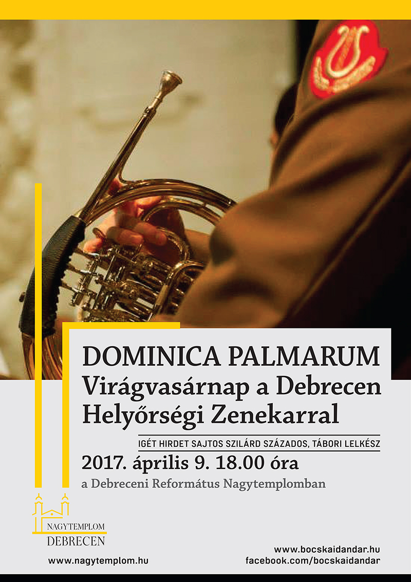 Időpont: 2017. április 9., virágvasárnap 16:00 barkaszentelés, ünnepi bevonulási menet néptáncos lányokkal 16:30 "Jézus keresztútja a családban" - bibliai keresztútjárás 18:00 Dominica Palmarum - a debreceni Helyőrségi Zenekar zenés áhítata a Nagytemplomban Igét hirdet: Sajtos Szilárd százados, tábori lelkész Közreműködik: Veres Hunor és a Kispendely énekegyüttes. Az eseményhez kapcsolódó plakátok a mellékeletben elhelyezett csatolmányban megtekinthetők.