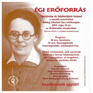 Május 10-én, szombaton Égi erőforrás címmel közbenjáró imaestet szervez a Szociális Testvérek Társasága Boldog Salkaházi Sára emléknapjára.