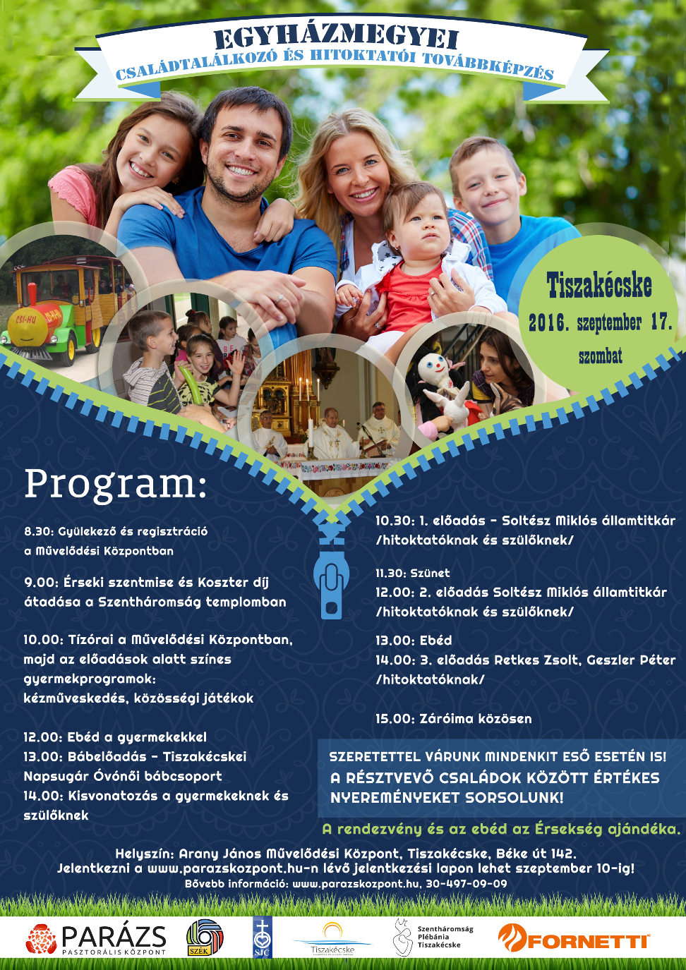 Program: Az érseki szentmisét Soltész Miklós államtitkár és Sipos Zsolt lelkigondozó előadásai követik, miközben a gyermekeknek színes programokat biztosítanak a Parázs Pasztorális Központ és a tiszakécskei Szentháromság Plébánia szervezésében.