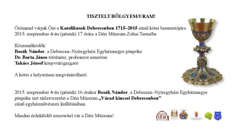 Ezt követően, 17 órakor kezdődik a helyszínen a Katolikusok Debrecenben 1715-2015 című kötet sajtó-és közönségbemutatója.