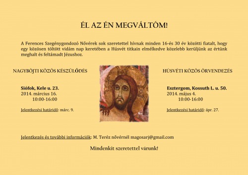 A Ferences Szegénygondozó Nővérek lelkinapokat szerveznek fiataloknak idén tavasszal. Él az én Megváltóm! címmel nagyböjti lelkinapot tartanak március 16-án siófoki rendházukban (8600 Siófok, Kele u. 23.)
