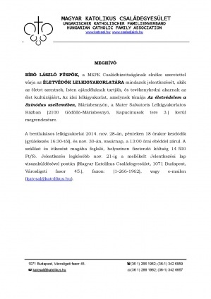 Bíró László püspök, a Magyar Katolikus Püspöki Kar (MKPK) Családbizottságának elnöke szeretettel várja az életvédők lelkigyakorlatára mindazok jelentkezését, akik az életet szentnek, Isten ajándékának tartják, és tevékenykedni akarnak az élet kultúrájáért.