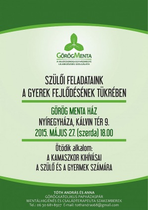 A Görög Menta Ház Szülői feladataink a gyermek fejlődésének tükrében címűelőadássorozatának következő alkalmára várják és hívják az érdeklődőket május 27-én, szerdán 18 órakor.