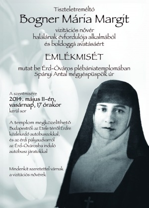 Május 11-én, vasárnap 17 órakor Bogner Mária Margit vizitációs nővér halálának évfordulója alkalmából és boldoggá avatásáért emlékmisét mutat be Érd-Óváros plébániatemplomában Spányi Antal megyéspüspök.