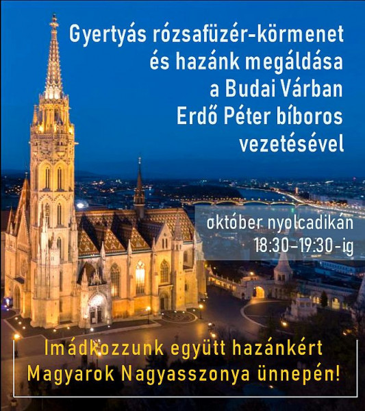 Október 8-án, Magyarok Nagyasszonya ünnepén este fél héttől az Emmánuel Közösség, a Szeretetláng Mozgalom, a Szociális Testvérek Társasága, valamint több egyházi közösség gyertyás rózsafüzér-körmenetre hívja mindazokat, akik szívükben hordozzák hazánk, Európa és a világ békéjét és védelmét.