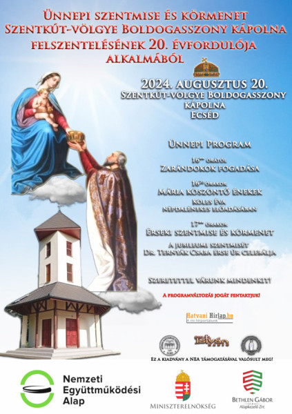 A Heves vármegyei Ecséd szélén, festői környezetben található Szentkút-völgye Boldogasszony-kápolna felszentelésének 20. évfordulóját ünneplik augusztus 20-án, a 17 órakor kezdődő érseki szentmise keretében.
