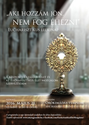 Eucharisztikus lelkinapot szervez az Eucharisztikus Élet Mozgalom és a Központi Oltáregyesület, „Aki hozzám jön, nem éhezik” (Jn 6,35) címmel 2016. május 21-én az Örökimádás-templomban.