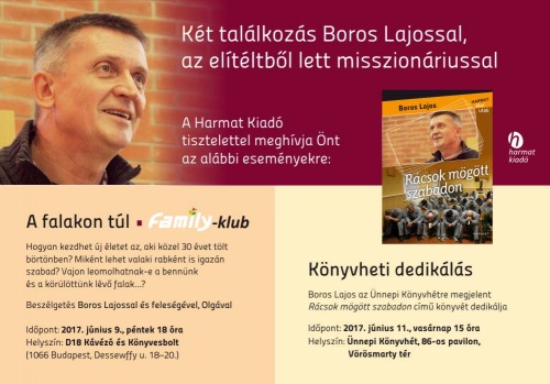 Időpont: 2017. június 9., péntek 18:00 óraHelyszín: D18 Café & Bar (Budapest, VI. ker. Dessewffy u. 18-20.)Vendég: Boros Lajos az elítéltből lett misszionárius