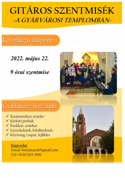 A győr-gyárvárosi Jézus Szíve-templomban 2022. május 22-én (vasárnap) 9 órakor gitáros szentmise kezdődik.
