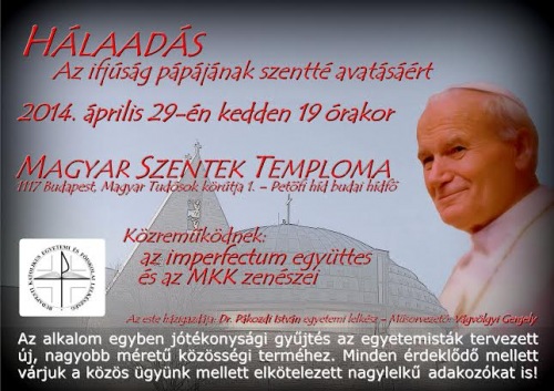 Április 29-én, kedden 19 órakor hálaadó ünnepséget tartanak II. János Pál pápának – az ifjúság pápájának – szentté avatásáért Budapesten.