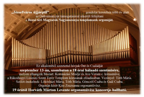 Szeptember 13-án, szombaton a 18 órai hálaadó szentmise lesz a templom orgonájának felújítása alkalmából.