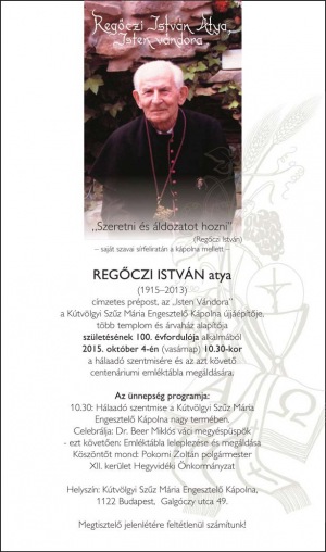 Regőczi István atya (1915–2013) címzetes prépost, az „Isten Vándora”, a Kútvölgyi Szűz Mária engesztelő kápolna újjáépítője, több templom és árvaház alapítója születésének 100. évfordulója alkalmából október 4-én, vasárnap 10.30-kor a hálaadó szentmisére és az azt követő centenáriumi emléktábla megáldására hívják és várják a híveket.