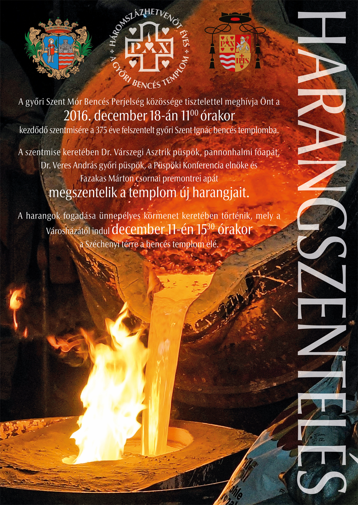 A 2016. december 18-án 11 órakor kezdődő szentmise keretein belül Várszegi Asztrik OSB püspök, pannonhalmi főapát, Veres András győri megyéspüspök, a Magyar Katolikus Püspöki Konferencia elnöke és Fazakas Márton csornai premontrei apát megszentelik a bencés templom új harangjait.