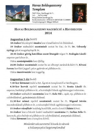 A Havihegyen, az 1690-es pestisjárvány elmúlásának emlékére felszentelt, s régóta búcsújáróhelyként tisztelt templomnál augusztus 4-én, hétfőn 19 órakor Udvardy György megyéspüspök mutat be szabadtéri szentmisét, melyet görögkatolikus szent liturgia, szentségimádás, szentmise és imavirrasztás követ. Másnap körmenettel és az egyházmegye papsága által bemutatott szentmisékkel folytatódik az ünnep.