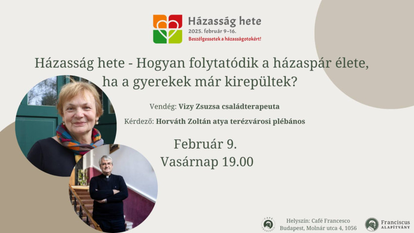 2025. február 9-én, vasárnap, 19.00 órakor , a Házasság Hete keretében az Esztergom-Budapesti Főegyházmegye Családreferatúrája szervezésében egy beszélgetésre hívunk minden érdeklődőt Vizy Zsuzsa családterapeutával.