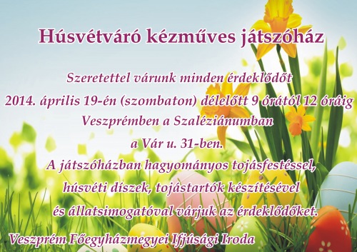Április 19-én 9-től 12 óráig húsvétváró kézműves játszóházat szerveznek (hagyományos tojásfestés, húsvéti díszek, tojástartók készítése, állatsimogató) Veszprémben, a Főegyházmegyei Ifjúsági Iroda és a Szaléziánum szervezésében.