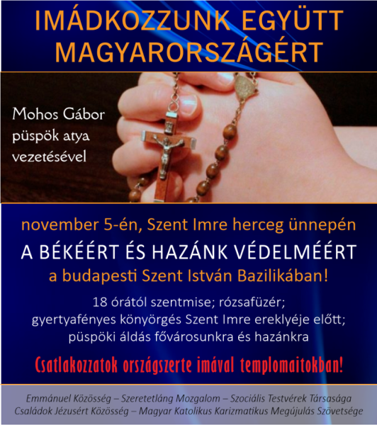 A több lelkiségi mozgalom által szervezett program 18:00 órakor szentmisével kezdődik, utána rózsafüzér, majd a bazilika főbejáratánál Mohos Gábor püspök úr, a hívek gyertyafényes menetét vezetve, Szent Imre herceg ereklyéjét felmutatva, a magyar ifjúság védőszentjének oltalmába helyezi hazánk, s különösen a fiatalok jövőjét; végül főpapi áldást ad a fővárosra és az egész országra.