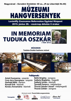 A nagyváradi Lorántffy Zsuzsanna Református Egyházi Központ Múzeumtermében június 28-án, vasárnap 18 órai kezdettel megemlékező hangversenyre hívják a szervezők a nagyközönséget, valamint azokat is, akik ismerték és tisztelték a nemrégiben elhunyt nagyváradi zenekritikust, Tuduka Oszkárt.