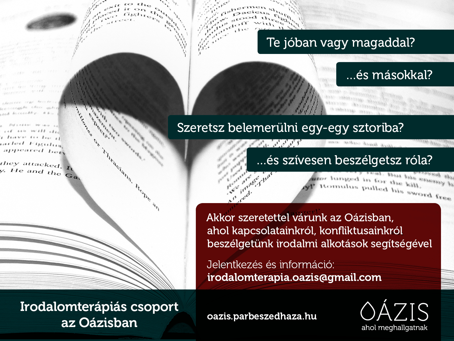 Jelentkezés: irodalomterapia.oazis@gmail.com