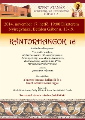A Kántorhangok sorozat részeként újabb koncertet rendeznek a Szent Atanáz főiskolán november 17-én, hétfőn 19 órakor, melynek keretében trubadúr énekek, bizánci és római rítusú himnuszok, Arhangelszkij, J. S. Bach, Beethoven, Bubnó László, Josquin des Pres, Purcell és Schubert művei csendülnek fel, valamint guzsalyas népzenét is hallhatnak az érdeklődők.
