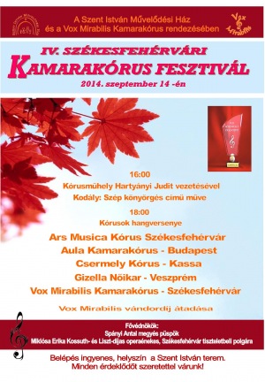 A Vox Mirabilis Kamarakórus és a Szent István Művelődési Ház immár negyedik alkalommal rendezi meg a Kamarakórus Fesztivált szeptember 14-én, vasárnap a Szakrális Művészetek Hete nyitórendezvényeként Székesfehérváron.