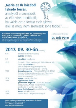 A Szűzanya fatimai megjelenésének 100. évfordulóján és Szent László király trónralépésének 940., szenttéavatásának 825. évében a Budapest-Rákospalotai Magyarok Nagyasszonya Főplébánia 2017. szeptember 30-án, szombaton találkozót szervez.