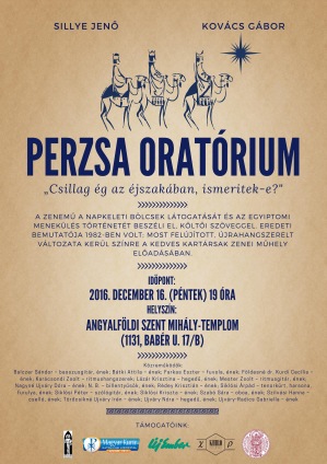 December 16-án, pénteken 19 órakor, az Angyalföldi Szent Mihály-templomban (XIII. kerület, Babér u. 17/b.) bemutatják Sillye Jenő énekes-dalszerző Kovács Gábor pap-költő szövegére készült Perzsa oratórium című zeneművet, amely a napkeleti bölcsek látogatását és az egyiptomi menekülés történetét beszéli el.