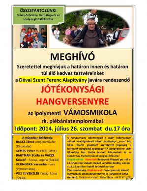 Július 26-án, szombaton 17 órakor a Dévai Szent Ferenc Alapítvány javára rendezett jótékonysági hangversenyre hívják a szervezők a határon innen és határon túl élő testvéreket az ipolymenti Vámosmikola római katolikus plébániatemplomába.