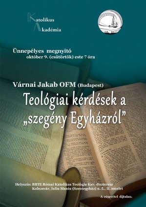 Idei első előadását a budapesti Sapientia Szerzetesi Hittudományi Egyetem rektora, Várnai Jakab ferences szerzetes tartja Teológiai kérdések a „szegény Egyházról” október 9-én, csütörtökön.