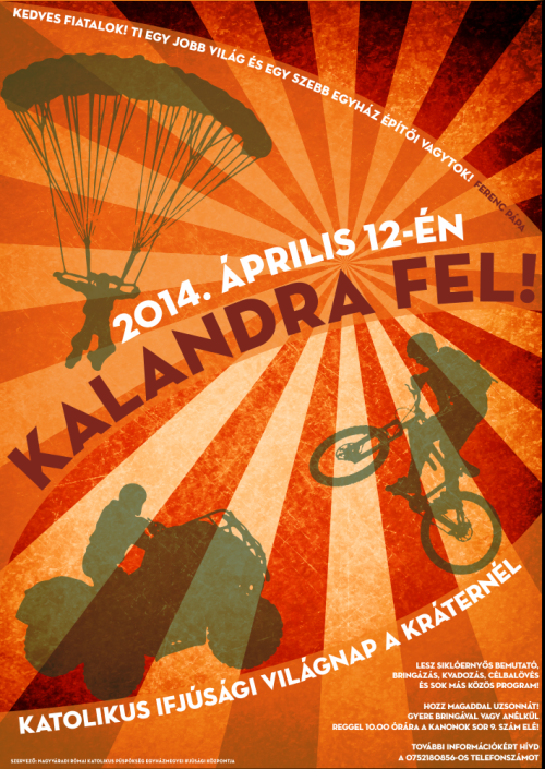 Április 12-én, virágvasárnapot megelőző szombaton Kalandra fel! címmel a nagyváradi Egyházmegyei Ifjúsági Központ Ifjúsági Világnapot szervez a Nagyvárad közelében található Kráternél.