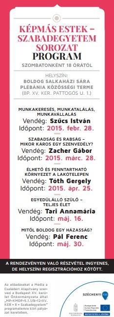 A Képmás magazin és a Média a Családért Alapítvány szervezésében Képmás-estek – szabadegyetemi előadássorozat rendezvények várják az érdeklődőket szombatonként a 17 órai szentmise után 18 órától a Boldog Salkaházi Sára-plébánia közösségi termében (1156 Budapest, Pattógós u. 1.).