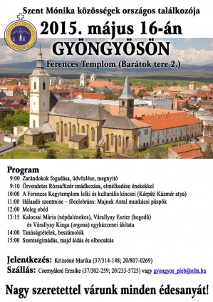 A Keresztény édesanyák Szent Mónika közössége május 16-án, szombaton rendezi országos találkozóját a gyöngyösi ferences templomban (3200 Gyöngyös, Barátok tere 2.).