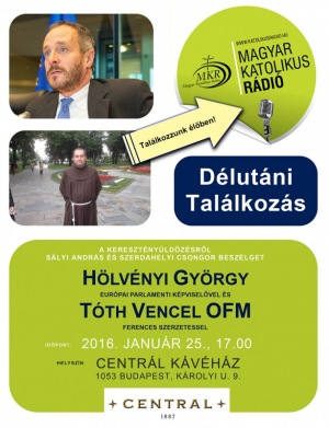 Meghívott vendégek: Hölvényi György európai parlamenti képviselő és Tóth Vencel OFM Időpont: 2016. január 25., 17.00 óraHelyszín: Centrál Kávéház, galéria – 1053 Bp. Károlyi Mihály u. 9.