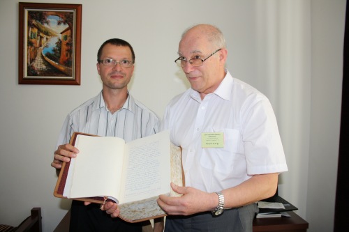 A fényképen Kádár László könyvkötő és Benyik György bibliakutató látható.