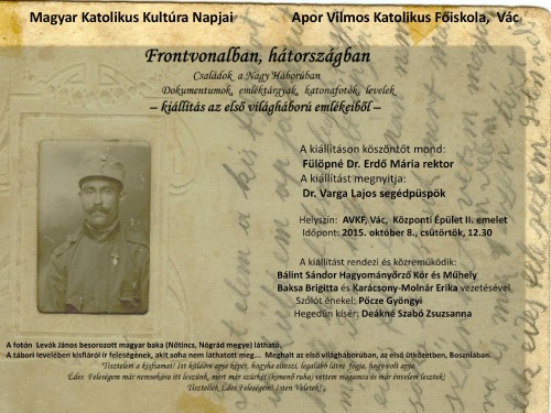 A Magyar Katolikus Kultúra Napjai rendezvényeként Frontvonalban, hátországban – Családok a Nagy Háborúban címmel kiállítás nyílik az első világháború emlékeiből (dokumentumok, emléktárgyak, katonafotók, levelek) október 8-án, csütörtökön 12.30-kor.