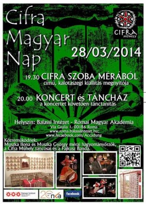 Március 28-án, pénteken 19.30-tól a Cifra szoba Mérából című, kalotaszegi kiállítás megnyitója, majd 20 órától a Cifra Műhely koncertje és táncháza kezdődik a Római Magyar Akadémián (via Giulia, 1).