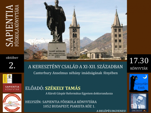 Program: Jos Decorte emlékest és az Országos Könyvtári Napok rendezvénysorozat keretében "A keresztény család a XI-XII. században Canterbury Anselmus néhány imádságának fényében" című előadás